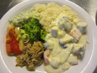 Vegetarisk gryta med quorn & böner serveras här med ris, bönsallad, broccoli, örtröra & rödlöksmarinerad risoni |